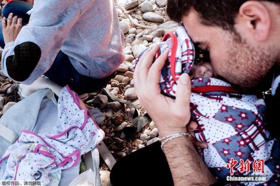 当地时间9月21日,一对叙利亚夫妇日前冒着生命危险,带着仅8个月大的双胞胎婴儿偷渡爱琴海,从土耳其抵达希腊。在海滩上,一个婴儿躺在手提包中酣睡,嘴里还叼着奶嘴;另一个孩子被裹在毯子中,他似乎已经清醒过来,脸上还露出甜美的笑容。这对双胞胎及其父母是近来乘坐临时船只穿过爱琴海到达欧洲的叙利亚难民之一。