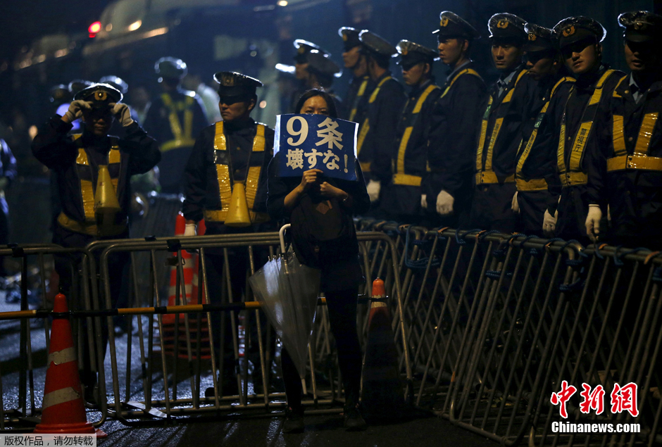 一名抗议的日本女性高举写有和平宪法9条字样的口号,在列队的安保警察前表示抗议。日本社会一致认为,强制推出的新安保法案违反了宪法,它最重要的目的是两条:一是解禁集体自卫权,也就是从此以后可以为美国等盟国出兵;二是扩大日本自卫队的海外活动范围。毫无疑问,这是与”和平宪法”第九条中“永远放弃以国权发动的战争”的核心思想完全背道而驰的。