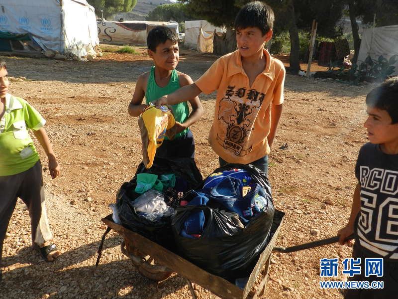 宰牲节前夕,在黎巴嫩南部马家永地区一叙利亚难民营,小难民为父母分忧,推着小车卖衣服。新华社发(塔希尔摄)