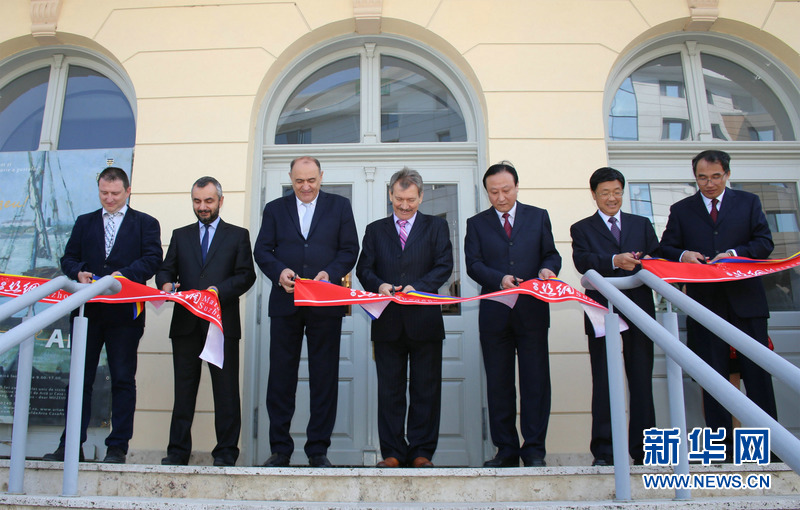 罗政府驻图尔恰县特派专员伯迪策(左三)、图尔恰县议会副主席斯特拉特(左四)、苏州市委宣传部副部长孙艺兵(右三)和中国驻康斯坦察总领事宿彦文(右二)为《丝绸之路》展剪彩。新华社发(甄淑琴摄)