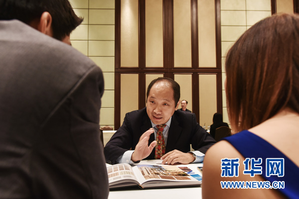 9月22日,一家中国广东建材企业的负责人(中)在泰国曼谷参加“2015中国(广东)-泰国经贸合作座谈对接会”对口洽谈,向有合作意向的泰国企业介绍瓷砖产品。新华社记者李芒茫 摄
