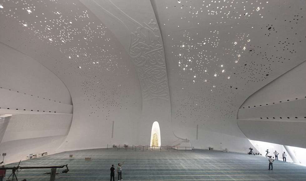 卡塔尔伊斯兰研究学院内部,灯光在天花板上跳跃。(网页截图)