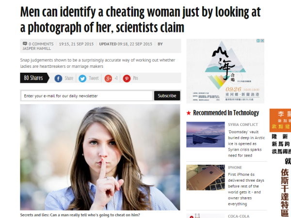 澳洲研究显示,男性只要透过照片,就能分辨出女性是否对感情忠诚。(图片源自《镜报》)