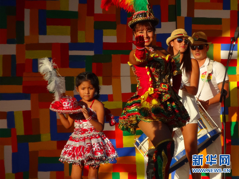 2015年圣梅尔塞节期间,巴塞罗那市中心的加泰罗尼亚广场,一群来自玻利维亚的演员在台上表演。新华社记者周喆 摄