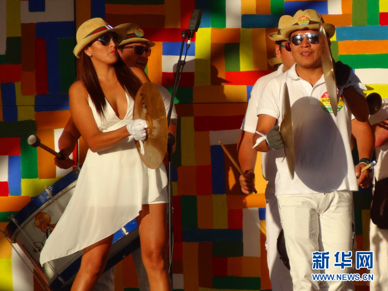 2015年圣梅尔塞节期间,巴塞罗那市中心的加泰罗尼亚广场,一群来自玻利维亚的演员在台上表演。新华社记者周喆 摄