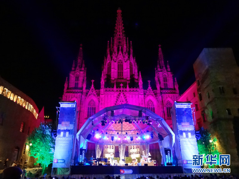 2015年圣梅尔塞节期间,巴塞罗那大教堂外晚间的音乐会。新华社记者周喆 摄