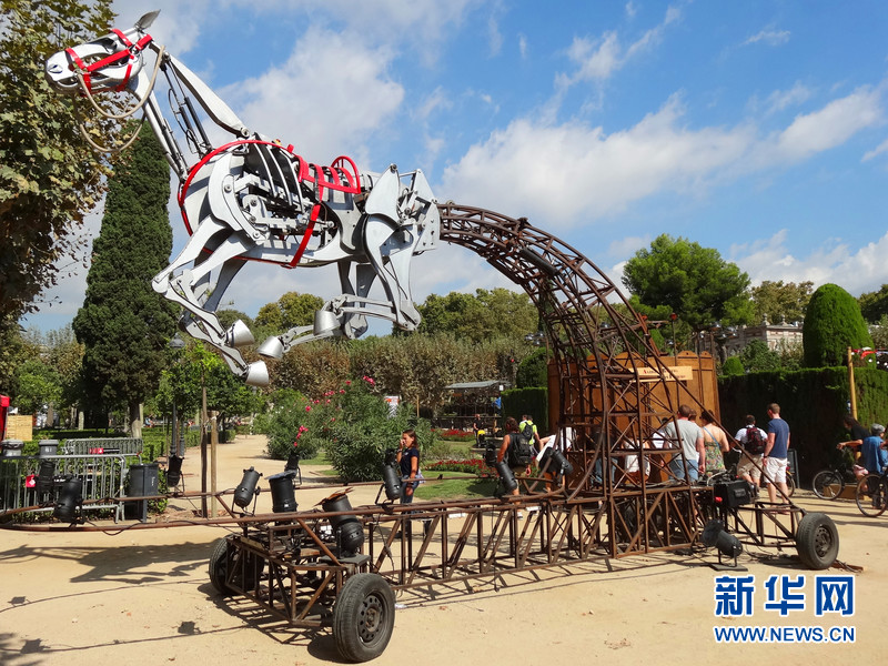 2015年圣梅尔塞节期间,巴塞罗那城堡公园里临时搭建的奔马雕塑。新华社记者周喆 摄