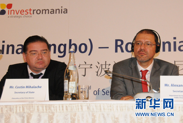 9月23日,罗总理府国务秘书米哈拉凯(左)和外资署国务秘书讷斯塔塞在投资论坛会上。新华社记者林惠芬 摄