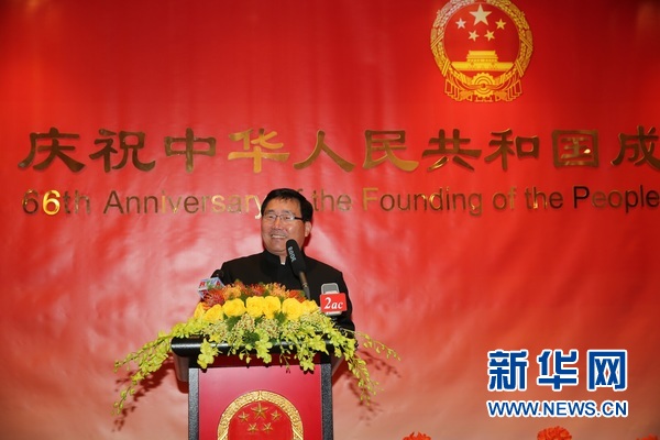 9月23日,在澳大利亚悉尼,中国驻悉尼总领事李华新在招待会上致辞。当日,中国驻悉尼总领馆举行国庆招待会,庆祝中国人民共和国成立66周年。新华社记者曹杨 摄