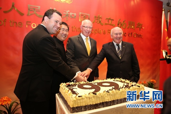 9月23日,在澳大利亚悉尼,中国驻悉尼总领事李华新(左二)与来宾同切印有数字“66”的纪念蛋糕。当日,中国驻悉尼总领馆举行国庆招待会,庆祝中国人民共和国成立66周年。新华社记者曹杨 摄