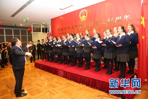 9月23日,在澳大利亚悉尼,来自于育文武女子学校的学生们现场演唱《茉莉花》等中文歌曲。当日,中国驻悉尼总领馆举行国庆招待会,庆祝中国人民共和国成立66周年。新华社记者曹杨 摄