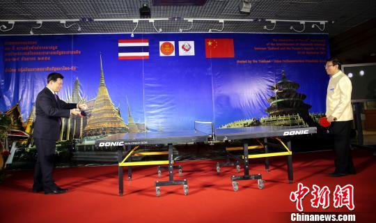 庆祝中泰建交40周年系列活动24日在曼谷国会大厦举行。会场主席台摆放着一张乒乓球桌,中国驻泰大使宁赋魁与泰国立法议会主席蓬佩现场“切磋”球技,以此纪念和重温40多年前上演的中泰“乒乓外交”。