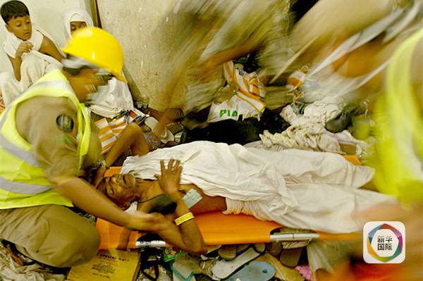2004年2月1日,在伊斯兰教圣地麦加附近的米纳,朝觐者在这里参加射石仪式时因拥挤造成惨剧,导致251人死亡、244人受伤。图为2月1日,医务人员在紧急救护一名受伤的朝觐者。
