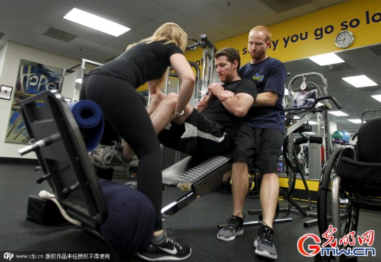 当地时间2015年9月24日,美国加州,Adam Fritz尝试脑机接口技术。脑通过直接从大脑提取信号来控制外部设备,在人的大脑和外部设备之间建立了直接联系,瘫痪的Adam Fritz成为首例不用借助机械臂行走的病人。