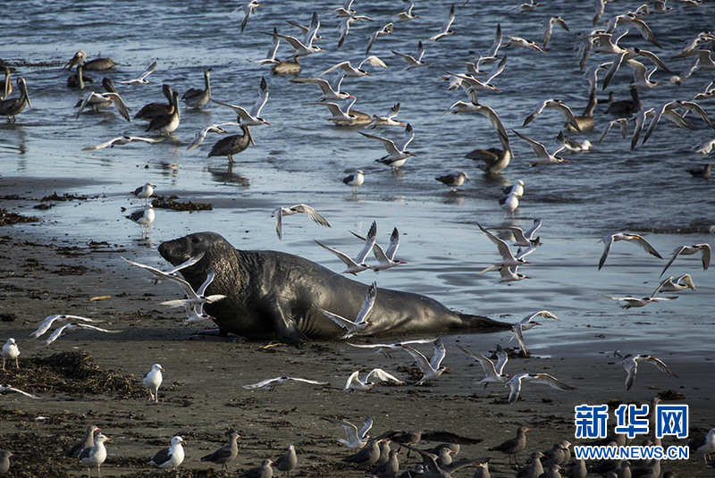 8月16日, 在加利福尼亚州海岸附近圣西蒙市的彼德拉斯内格兰卡斯海滩上,一群鸟从一只象海豹飞过。新华社发(赵汉荣摄)