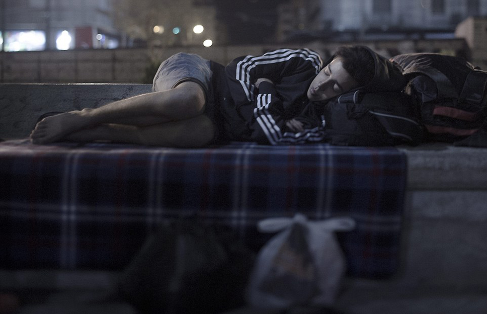17岁的Abdul Karim睡在希腊首都雅典的街头。这位少年用身上仅存的欧元买了开往雅典的船票。如今他身无分文,只能在雅典的奥蒙尼亚广场过夜,那里聚集着上百的移民。(网页截图)