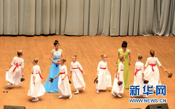 中国留学生李雪梅、赵俊杰在白俄罗斯儿童伴舞下演唱《映山红》。新华社记者陈俊锋摄