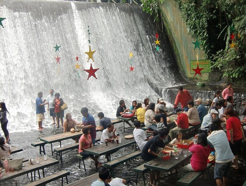 菲律宾瀑布餐厅:瀑布餐厅位于菲律宾的Escudero度假村中,客人进餐时就坐在巨大的人工瀑布旁边,水流穿过脚底。餐厅里都是竹制桌子。餐厅里用竹叶盛放各种当地美食。餐厅鼓励客人在进餐结束后下去嬉水玩耍。(网页截图)