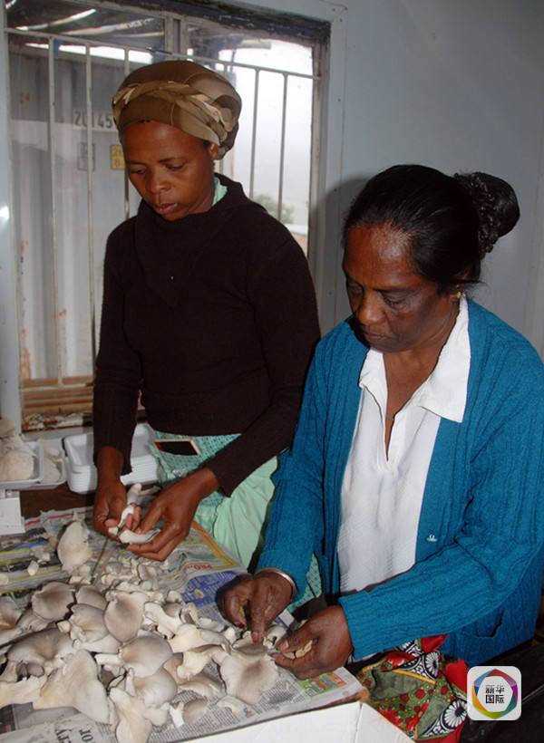 2007年10月4日,在南非东南部祖鲁王国山区夸丁迪村,当地妇女包装加工自己种植的蘑菇。2005年1月,福建农林大学的中国菌草蘑菇专家林占教授把菌草蘑菇栽培技术引入祖鲁王国,经过教授和试种,蘑菇已经成为当地农民脱贫致富的希望。新华社记者陈铭摄