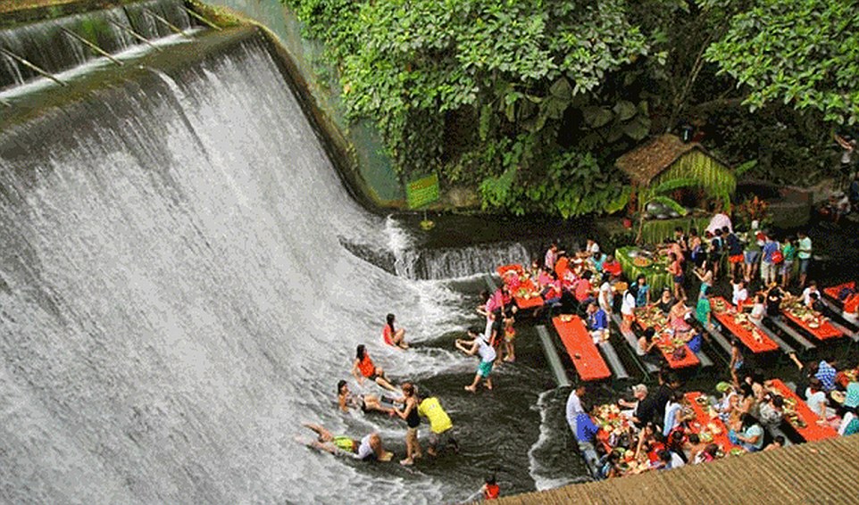 瀑布餐厅位于菲律宾的Escudero度假村中,客人进餐时就坐在巨大的人工瀑布旁边,水流穿过脚底。餐厅里都是竹制桌子。餐厅里用竹叶盛放各种当地美食。餐厅鼓励客人在进餐结束后下去嬉水玩耍。(网页截图)
