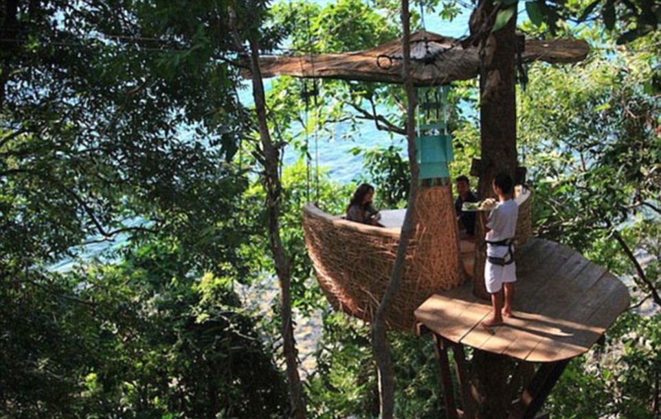 泰国树荚餐厅:树荚餐厅位于苏尼瓦奇瑞度假村(Soneva Kiri)。在这里用餐的客人在食物上来之前就被送到约离地5米处的树顶,从高处欣赏海湾美景。送餐的服务员用滑行索将食物送给客人。餐厅希望以此帮人们实现爬上树冠的愿望。(网页截图)