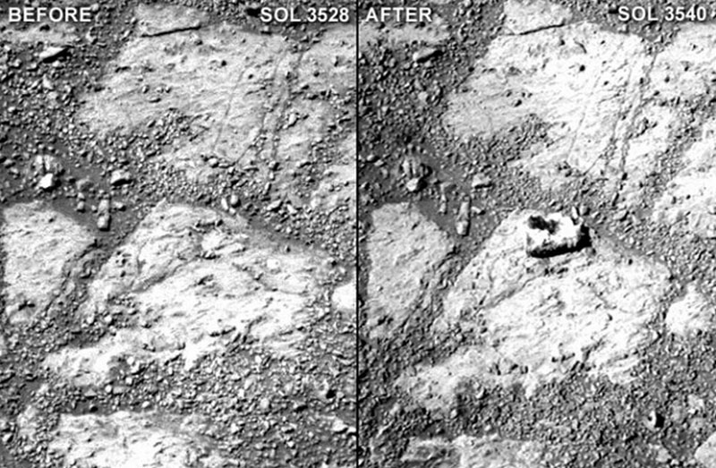 火星上的怪异物体除了像人形,还有的像甜品。“好奇”号探测器曾经拍到类似果冻甜甜圈形状的物体,有些人认为,这个物体可能是外星真菌,但美国宇航局对此不置可否。最终,美国宇航局宣布,这块突然出现的石头是“好奇”号在移动时撞上它的结果。(网页截图)