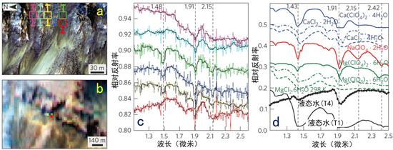 上图中,a和b中的彩色方框为光谱测量的区域;c为光谱测量结果,不同颜色的谱线分别对应于a和b图中不同的测量区域。d为地面实验室内测得的各种含水盐类化合物的谱线。