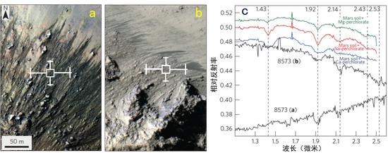 上图中,a为源自Horowitz撞击坑中央峰基岩的季节性坡纹(HiRISE影像,摄于第28个火星年),b为同一HiRISE影像中另一中央峰上的季节性坡纹(比例尺同a)。c图中的两条黑色谱线分别为CRISM测得的图a和图b中方框区域的光谱,彩色谱线为火星土壤光谱与各种盐类光谱混合的结果,从上到下依次为火星土壤与高氯酸镁、高氯酸钠、高氯酸钙的混合光谱。