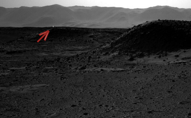 2014年,“好奇”号探测器传回怪异照片,显示火星地平线远处传来一束亮光。这张照片令许多UFO粉丝激动不已,他们猜测亮光的来源,想知道其是否是外星人活动的证据。美国宇航局科学家道格·埃里森(Doug Ellison)则解释称,这很可能是宇宙射线击中火星,高能粒子穿越太空所致。(网页截图)
