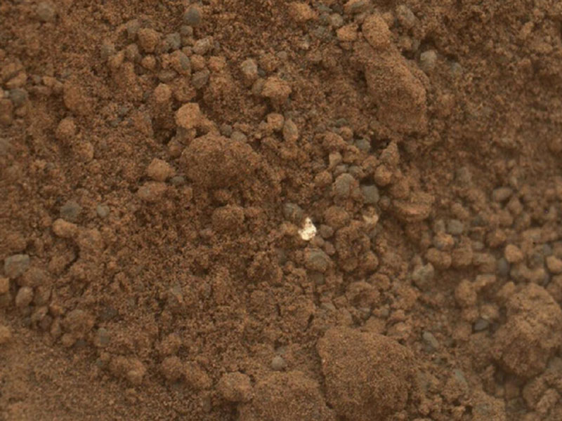 2012年,“好奇”号探测器在火星暗色土壤中发现明亮发光物体。在透视图中,整张照片覆盖的区域仅1.6英寸(约合4厘米)。美国宇航局科学家称,这种微小的发光点只是火星上的自然物质。(网页截图)