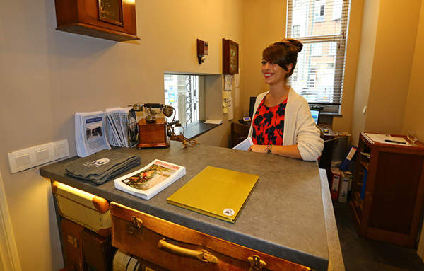火车主题旅馆的前台:桌子下面的老式旅行箱令人想起以前的火车站。