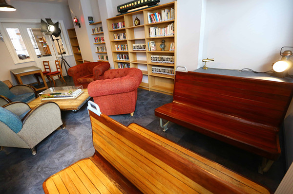 火车主题旅馆中的客人休息室。