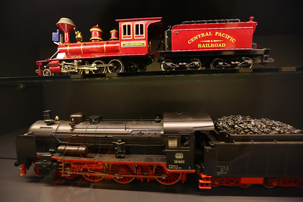 火车主题旅馆楼道中摆放的火车模型。