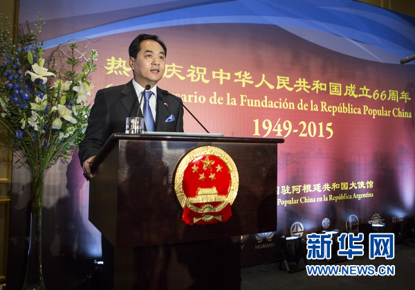 中国驻阿根廷大使馆29日在布宜诺斯艾利斯举行招待会,庆祝中华人民共和国成立66周年。阿根廷政要、华侨华人、中资机构及留学生代表约500人出席庆祝活动。新华社记者叶书宏摄