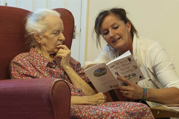 ↑英国埃文河畔斯特拉特福的一家养老院,志愿者为患有老年痴呆症的老人读书。