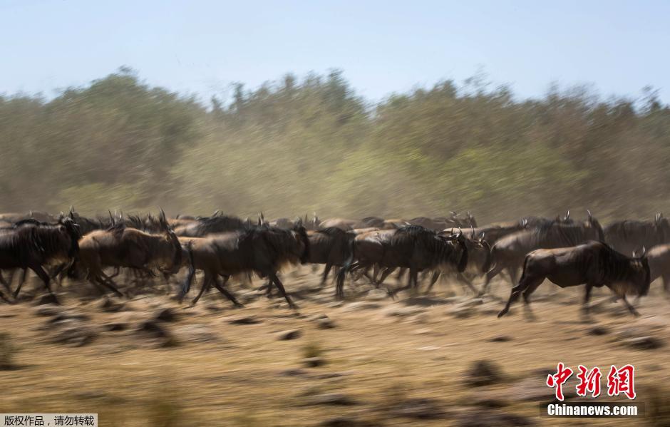 当地时间9月29日,肯尼亚马赛马拉国家保护区内迁徙中的角马。每一年,成千上万的角马、斑马和其他动物在坦桑尼亚和肯尼亚之间的迁徙被称为世界七大天然奇景之一。