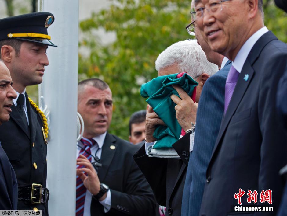 当地时间9月30日,巴勒斯坦国旗在位于美国纽约的联合国总部前徐徐升起。2012年11月29日,联大通过决议,决定在联合国给予巴勒斯坦观察员国地位;联大于本月10日以高票通过决议,允许联合国观察员国在联合国总部和各办事处升旗。