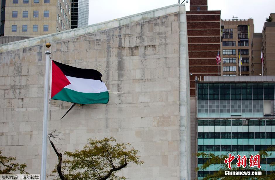 当地时间9月30日,巴勒斯坦国旗在位于美国纽约的联合国总部前徐徐升起。2012年11月29日,联大通过决议,决定在联合国给予巴勒斯坦观察员国地位;联大于本月10日以高票通过决议,允许联合国观察员国在联合国总部和各办事处升旗。