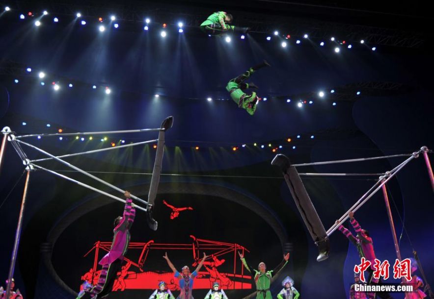 10月2日下午,第15届中国吴桥国际杂技艺术节B场比赛正如火如荼地进行着。来自俄罗斯、美国、法国、德国、中国等20个国家和地区的世界一流杂技团在此角逐“金狮奖”。中国吴桥国际杂技艺术节与摩纳哥蒙特卡洛国际马戏节、法国“明日与未来”国际马戏节并称世界杂技三大赛场。图为俄罗斯《浪桥》表演。中新社记者 翟羽佳 摄