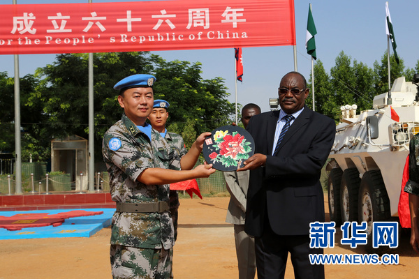 中国官兵的出色表现,同样得到当地群众的尊重和肯定。听说今天是中国的国庆日,南达尔富尔州州长艾萨奇专程赶来参加庆祝典礼,他紧紧地握着崔伟大队长的手感谢道,“长期以来,中国是苏丹好朋友,中国维和官兵来到这里又帮助我们修筑道路、架设桥梁,惠及苏丹人民,为苏丹和平建设事业做出了重要贡献……今天是中国的生日,祝愿中国人民生活更美好,苏中两国世代友好,源远流长!”