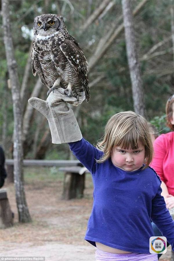 美国社交新闻网站Reddit的一名用户近日将这张照片发在了“P图大战”板块,写下了“不高兴的女孩高举猫头鹰”的文字说明。网络P神们一呼百应,纷纷发表了自己的P作,赋予女孩各种让人脑洞大开的形象。