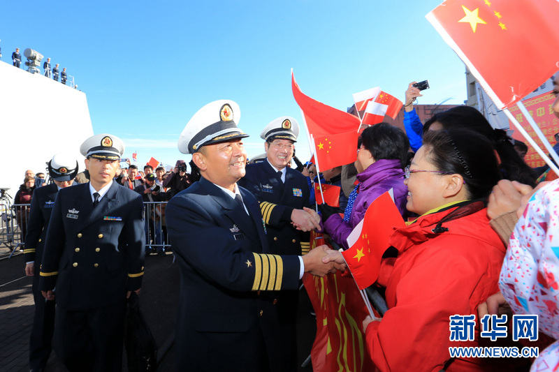 中国海军152舰艇编队指挥员王建勋(左三)和政委叶建林(左四)和前来欢迎的人员握手致意。新华社记者曾涛摄