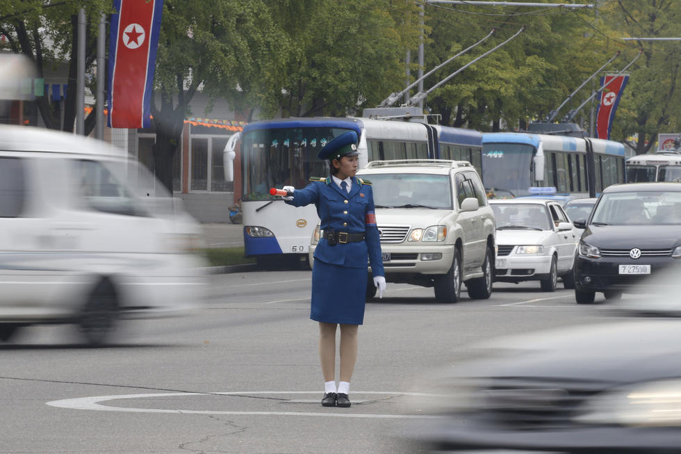 朝鲜劳动党即将举行成立70周年庆祝活动。当地时间2015年10月8日,朝鲜平壤,朝鲜劳动党成立70周年庆典前夕,一名女警在街头指挥交通。