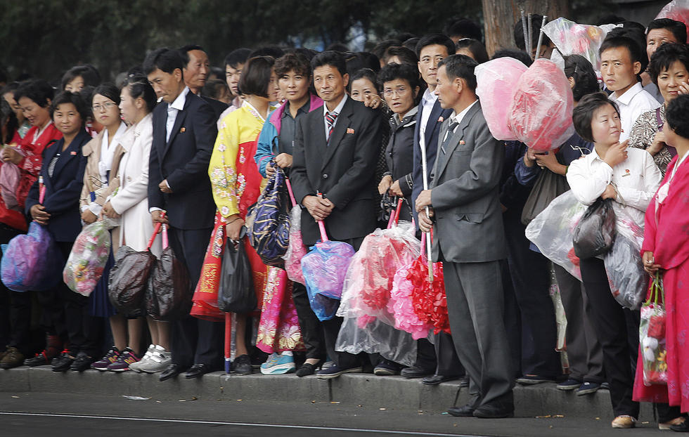 当地时间2015年10月8日,朝鲜平壤,民众手持朝鲜劳动党成立70周年庆典时使用的装饰花在街边的一个电车停靠站等车。
