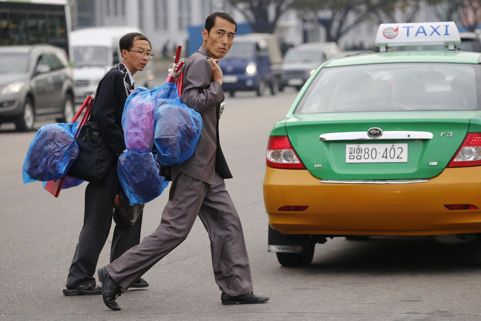 当地时间2015年10月8日,朝鲜平壤,民众背着装满于朝鲜劳动党成立70周年庆典时使用的装饰花的塑料袋过马路。