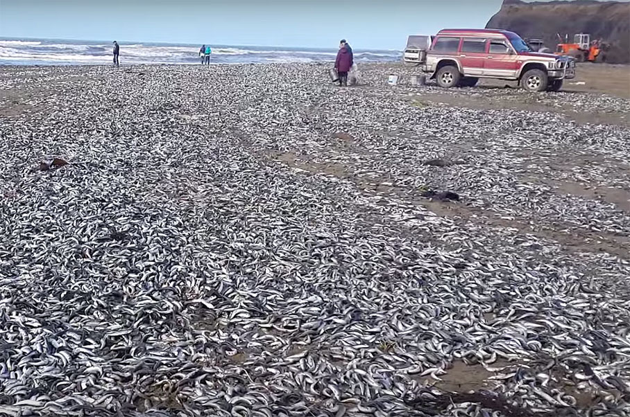 俄罗斯远东数万沙丁鱼被冲上岸。(网页截图)