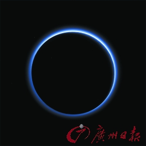 “新视野”号在7月14日的“会面”中拍摄了大量冥王星的照片,但直到上周才传回冥王星大气层的首批彩照,其中于本周公布的一张照片显示,在黑色的宇宙背景中,冥王星“发出”一圈淡淡的蓝光,这实际上是它的大气层的颜色。