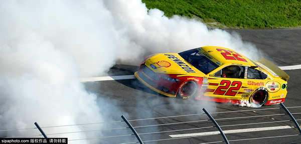 当地时间2015年10月11日,美国康科德,纳斯卡“Bank of America 500”赛车比赛现场惊现高空飞机吊环,场面惊险吓坏观众。(图片来源:Sipa)