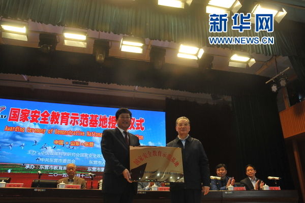 新华网山东东营10月12日电(记者 郝斐然)中国政策科学研究会国家安全政策委员会12日在山东省东营市为东营一中“国家安全教育示范基地”授牌。