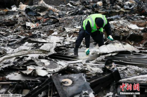 资料图:当地时间2014年11月16日,乌克兰顿涅茨克地区,坠毁MH17飞机残骸收集工作进行中。据悉,在事故现场已成功搜寻到起落架的部分残骸,一大块机身残片和以及疑似乘客遗体。专家们希望将这些残骸运往荷兰之后,能够通过技术手段还原某个部件,以确定事故具体原因。